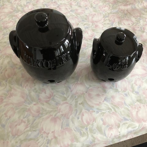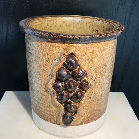Glaseret lerkrukke med låg og tryksten til at lave surkål og andre fermenterede grøntsager i. Højde uden låg: 24 cm, og den indeholder ca. 5 liter. Nypris kr. 800. Kan evt. leveres, når jeg er i København næste gang.