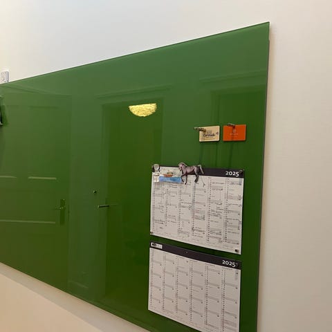Stor dansk designet lyseblå glastavle - ophæng og magneter medfølger. Måler 200 cm * 100 cm.