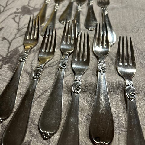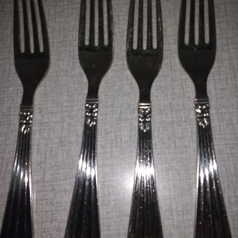 4 stk pålægsgafler HERTA - sølvplet. Med patina / ridser. Og den ene har et lille sort mærke. - se billede. Kan sendes for 47 kr