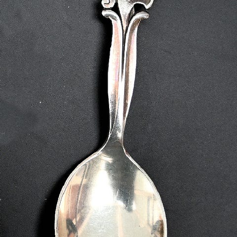 Enestående sølvmarmeladeske med hammerslået skaft ornamenteret i toppen af buket. Dertil et skeblad med yderligere dekorationsdetaljer.