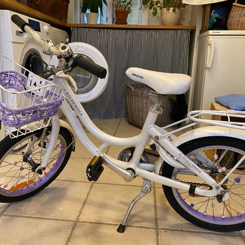 Fin og velholdt Kildemoes børnecykel, 16”, med støttehjul og pyntet cykelkurv.