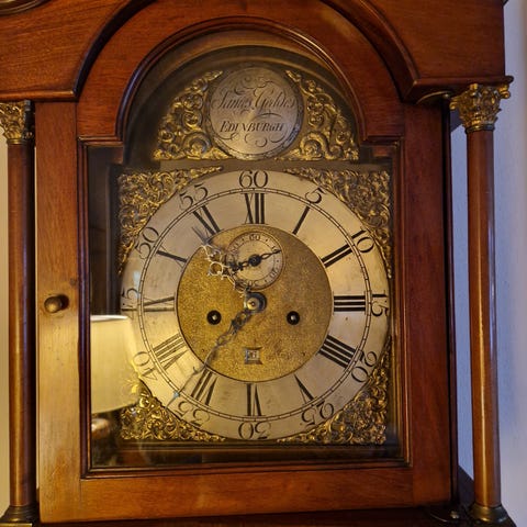 Gammelt standur udført i palisander med detaljeret udskæring og smuk malet urskive.