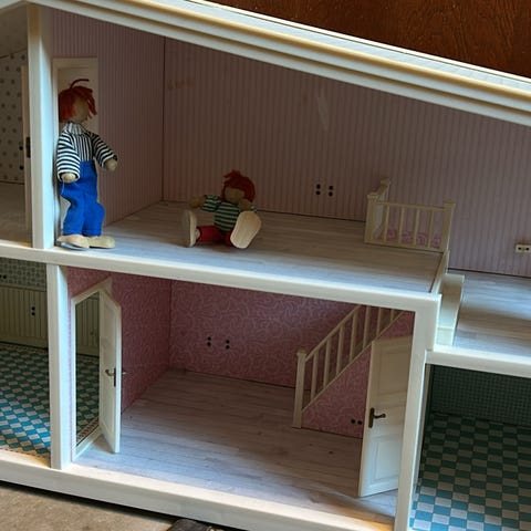 Lundby Dukkehus m. dukker og møbler. Brugt men stadig mange timers leg i det. Der er tegnet lidt med tus på huset. En dukke mangler arm og en anden mangler tøj.