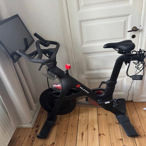 Peloton Exercisecykel i sort farve. Cyklen er designet til indendørs træning med justerbart sæde og styr for tilpasning til brugeren. Den har en integreret skærm til træningsprogrammer og interaktiv brug.
