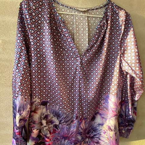 Dea Kudibal bluse i silke med multifarvet mønster. Blusen er i størrelse M og designet til kvinder. Den har lange ærmer med elastiske manchetter og rund hals med små plisseringer. Ny med prismærke