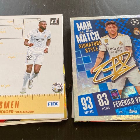 Real Madrid C.F. fodboldkort med billede af Ronaldo i hvid Real Madrid trøje. Kortet viser spilleren i aktion og indeholder UEFA Champions League branding.
