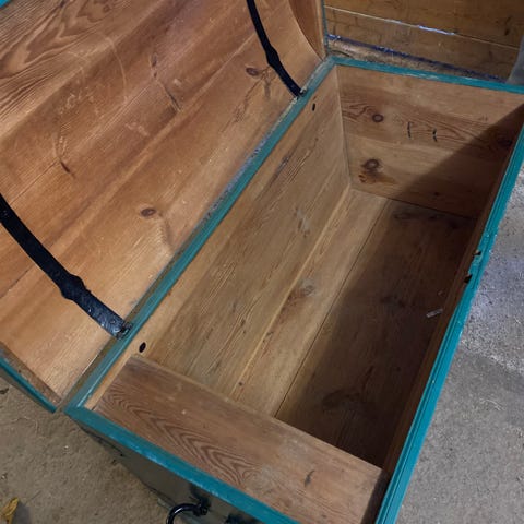 Antik stantrækiste med grønmalet almue overflade, dekoreret med blomsterkranse og årstal 1842. Kisten har en buet låg og en integreret skuffe i bunden. Fremstillet i fyretræ med metalbeslag. Egnet til opbevaring.har 2 skuffer i bunden og indvendig magasin samt flotte løse " ben " b. 143cm h. 65cm ( incl ben78cm d . 67 cm