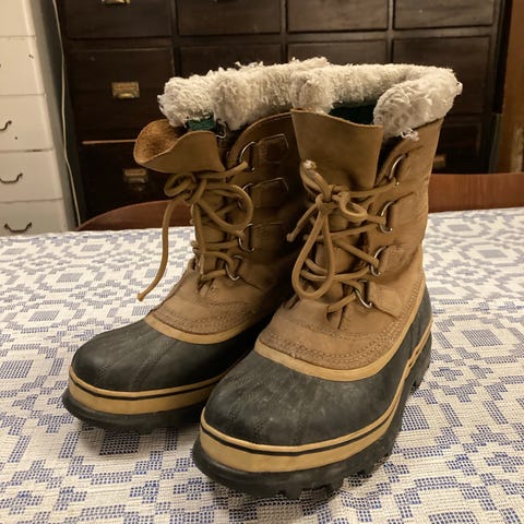 Sorel børnestøvler i unisex design, størrelse 33. Støvlerne er brunlige med sort gummisål og har en varm, foret inderside. De har snørebånd til justering for bedre pasform.