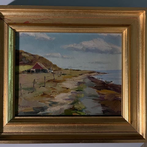 Signeret Ørbech maleri med motiv af landskab og huse.