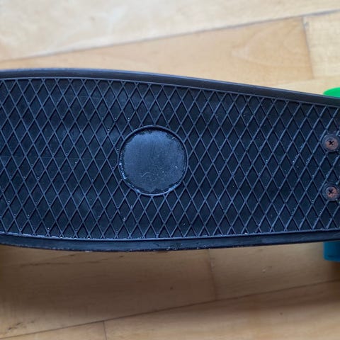Penny Skateboards Cruiserboard med et farvet dæk i hvid, blå og pink. Boardet har gule hjul og metal trucks. Designet til cruising og transport på glatte overflader. Velegnet til brug for både begyndere og øvede.