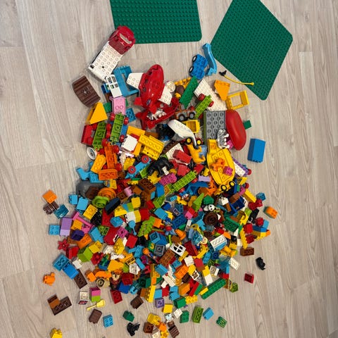 Over 21kg Dublin + to byggeplader. Tog, sørøverskib, arktisk zoo med mange dyr, stort dukkehus, mange biler herunder brand og lastbiler. Mange dyr og mennesker, Peter plys, æsel, kaptajn klo, og meget mere.