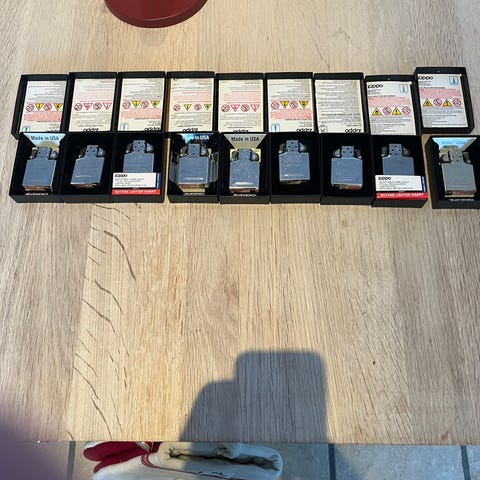 Zippo lighter sæt indeholdende en metal lighter, en dåse lighterbenzin og tilbehør til påfyldning og vedligeholdelse. Sættet leveres i en æske med plads til alle dele.