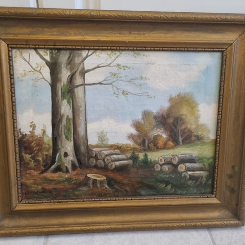 Muligvis Johan Snedker, olie på lærred, motiv af skovsti omgivet af træer. Dybe grønne og gule, farver.