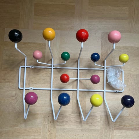 2 stk Eames Hang It All knagerække, på begge knager har den sorte knop lidt afskalning af maling pga dør har åbnet op i knagerækker.