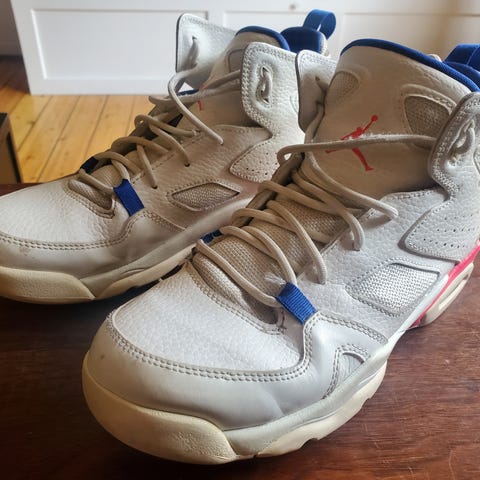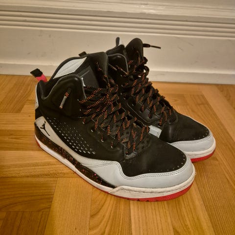 Jeg sælger et par Nike Air Jordan Flight 9.5 i en størrelse 42. De er god brugt med slid på indersiden af højre hæl og de har ikke originale såler.