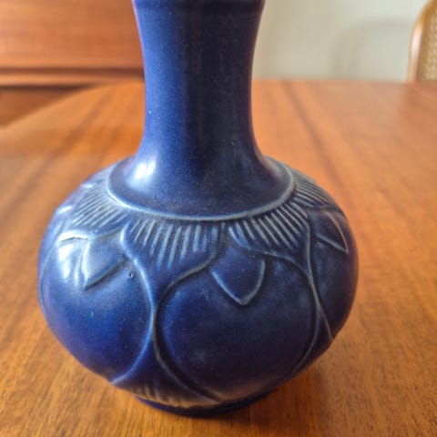 Hjorth Rønne keramikfigur af en kvinde iført blå kjole og sort overdel, der holder en kande. Figuren er fremstillet i keramik og har mærkat fra Bornholmsk Stentøj på undersiden.