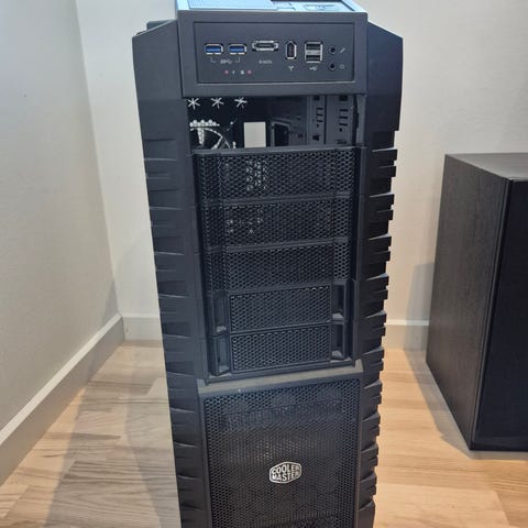 Dog sidder der 1X 200MM blæser i fronten med lidt blåt lys og der sidder også en i siden på det ene panel på 200MM med blå lys.