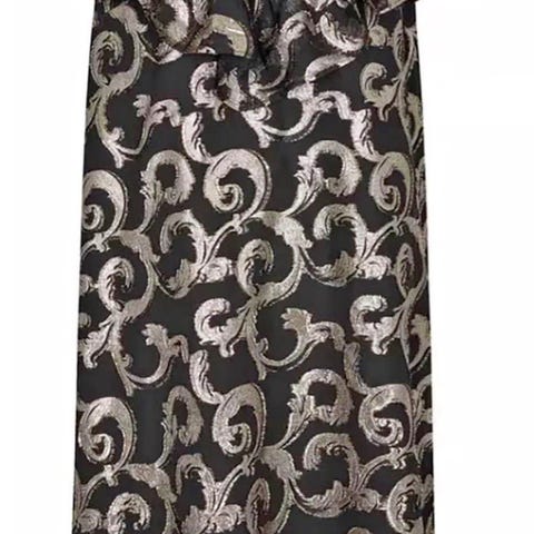 Flot halvlang kjole, der er lidt længere bagpå en foran (ca. 8 cm). Den er i sort/ guld og med et tyndt bælte/ bindebånd i taljen. Kjolen går lidt ned over knæene foran.