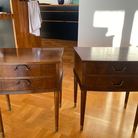 Har 2 sengeborde fra 1970’erne med enkelt skuffe. De måler 30 x 45 x 50. Pr. stk. 250,00.