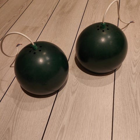 Lamperne er i god og intakt stand. De er 36 cm I diameter hele vejen rundt og er med deres nye ledninger på over to meter klar til at blive hængt op.