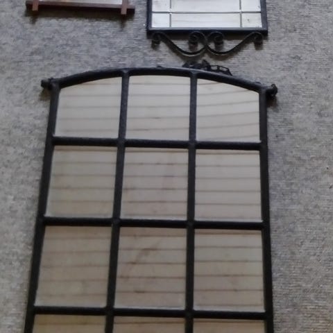 Stellet måler 67 cm bredt, 180 høj. 68 cm dybt. Selve spejlet er 57 cm bredt og 147 cm højt. Fra en tøjbutik. Fulgte med huset, da vi købte det. Det er massivt jern. Spejlet fejler intet.