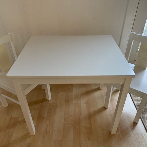 IKEA børnemøbelsæt bestående af et hvidt bord og to stole. Møblerne er designet til børn og har et enkelt og funktionelt design. Materialet er træ, og sættet er velegnet til børneværelser eller legeområder. Sættet viser brugsspor, herunder mærker og slid på hjørnerne af stolene.