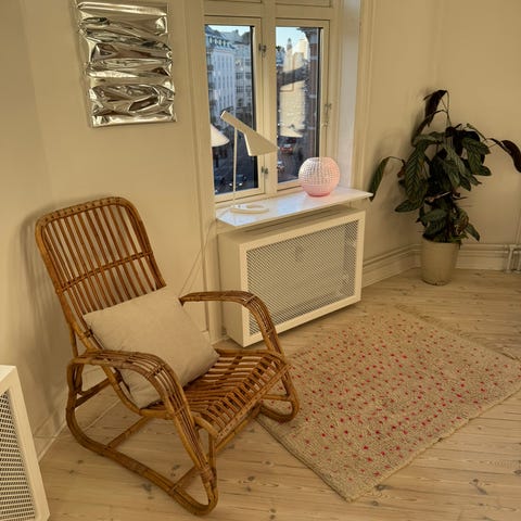 Flot bambus lænestol. Har lidt løs flet på den ene fod. Intet af betydning for funktionenaliteten