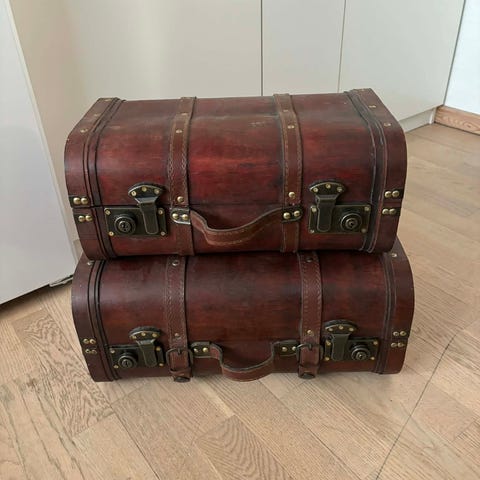 2 kurvekufferter sælges - den ene i mørkt flet og den anden i lysere flet. Mål: højde 50 cm, længde 90 cm, dybde 55 cm. Pris 400 kr. pr. stk.
