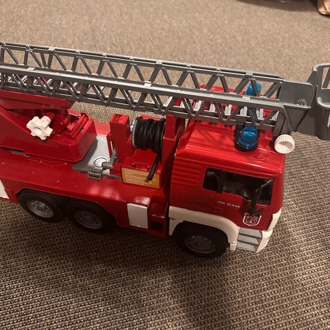 Stor ambulance fra Bruder med forskellige lyd/lys funktioner ( har fået helt nye batterier i), samt to mænd og en båre..