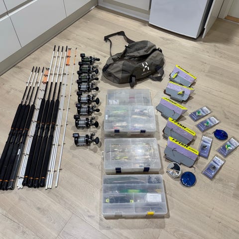 8 fiskestænger med skumgreb, multiplikatorhjul med line monteret, samt forskellige æsker med fiskegrej og tilbehør. Tre af hjulene har fletline monteret, de øvrige fem er med nylonline.