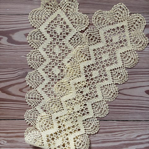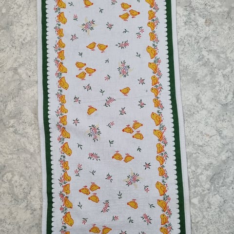 Påske bordløber. Måler ca. 120x46 cm. Har en enkelt lille plet, som ikke er foesøgt fjernet. Kommer fra røg- og dyrefrit hjem.