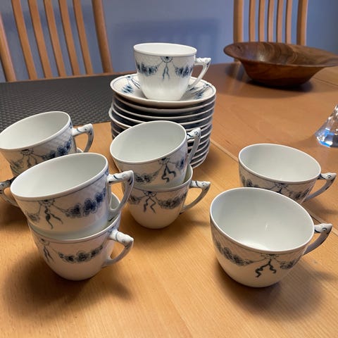 Royal Copenhagen kopper og tallerkener med blåt abstrakt mønster. Servicet består af flere kopper og tallerkener med unikt design. Fremstillet i porcelæn. Jeg har 3 kagetallerkener, 5 underkopper og 5 kopper