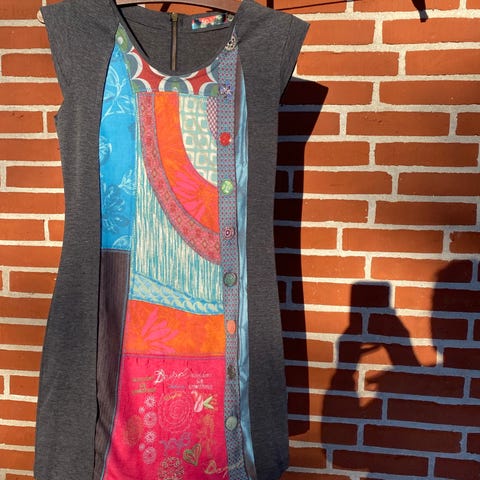 Festlig Desigual kjole i let materiale (viscose + polyester) str S/M. Længde ca 94 cm. Sort i grundfarven. Flot palmier blomst på brystet. Kjolen er egnet til hverdagsbrug og festlige lejligheder som fester, receptioner og fødselsdage. Brugt maks fem gange. Meget flot stand. Kan afhentes i Gødstrup, Århus eller Silkeborg efter aftale. Pris 99kr. Ved køb af yderligere to af mine kjoler fra "vinterkjole udsalget" kun 249kr for alle tre excl. porto.