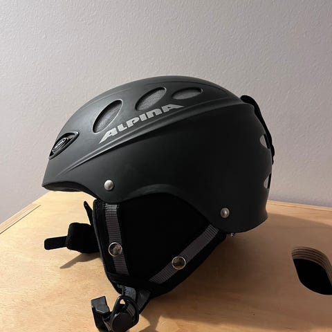 En skihjelm fra Alpina med visir. Str. 54 - 58 cm. Er stadig super behagelig indvendig og puderne fejler ingen ting.