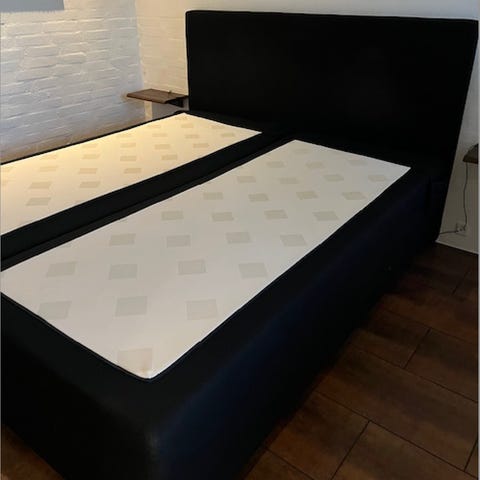 Dobbeltseng med tilhørende natborde i sæbebehandlet bøg og med elevationsbunde, som virke upåklageligt. To madrasser fra Zen Zell medfølger - lidt slid på hjørnerne af madrasserne. Mærke på sengen kendes ikke.