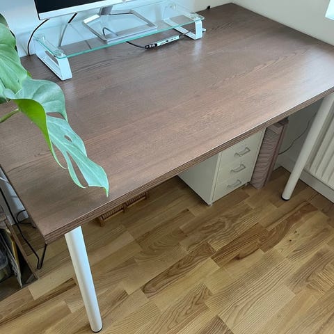 IKEA skrivebord med træbordplade og metalstel. Bordet har en rektangulær form med en hylde under bordpladen. Stellet er sort metal, og bordpladen har en træfinish.