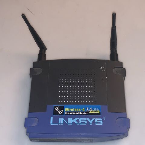 Linksys Wireless-G Broadband Router med 2.4 GHz trådløs netværksteknologi. Routeren har en blå og sort plastikudformning og leveres med strømforsyning. Designet til at forbinde og styre trådløse netværk.