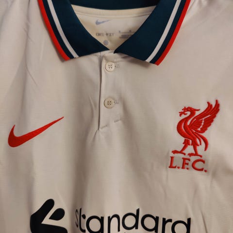 Nike Liverpool FC fodboldtrøje i rød farve. Trøjen har korte ærmer og er fremstillet med klublogo og sponsortryk. Trykket på brystet er desværre gået lidt af