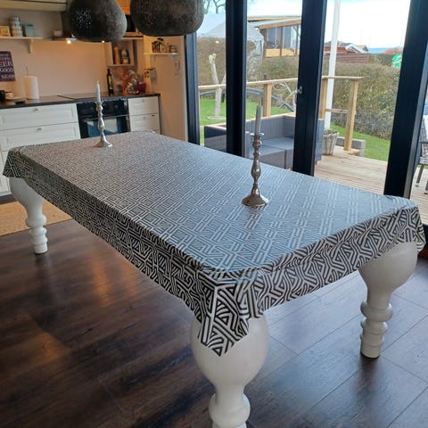 Lavet af et gammelt stål stel med en plade oven på. Pladen har fået lak. Pæn stand.