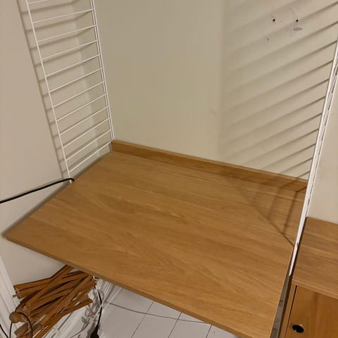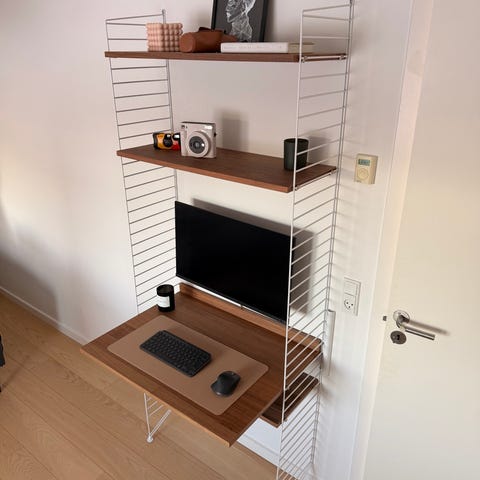 Skrivebord med skuffer, opslagstavle, hylder og stol