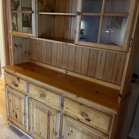 Skænk og vitrineskab fra Invita, af massiv kirsebærtræ. Vitrineskabet er i rigtig flot stand, mens skænken har fået fået et skæremærke i toppen (se sidste billede).