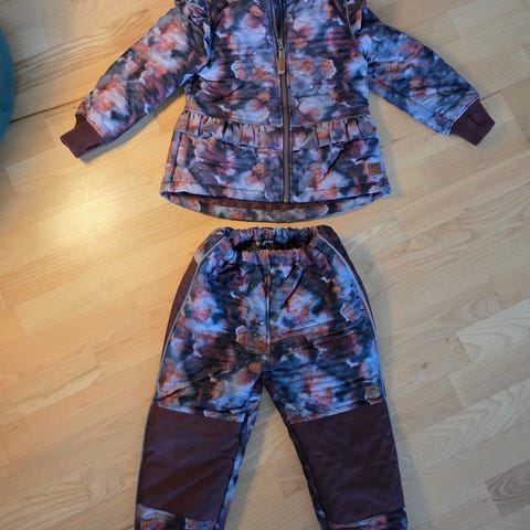 Termosæt med fleece fra Mikk-Line str. 74 / 9 - 12 mdr.. Der er ligeledes fleecefor i jakken, ekstra forstærkninger ved knæ og bagdel samt vindfang i buksebenene, justerbar talje, lommer og synlige reflekser flere steder. På termobukserne er der et par pletter fra mælkebøtte, som umiddelbart ikke går af i vask. Pris: 65 kr.