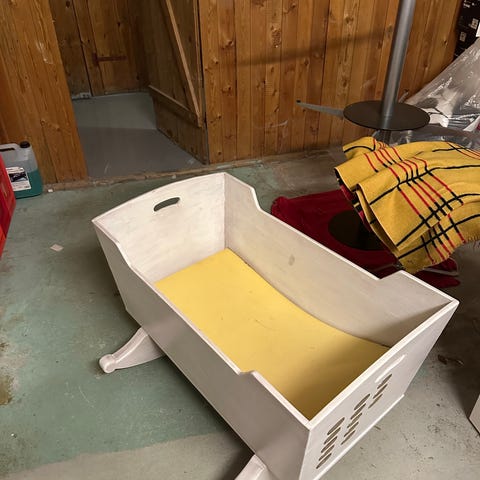 Meget smuk og elegant vugge til de helt små børn. Der er ingen synlige brugspor og den fremstår meget flot. Der er net og flet på siderne og vuggen er lavet i træ. Der er hjul til som nemt tages på og af igen.