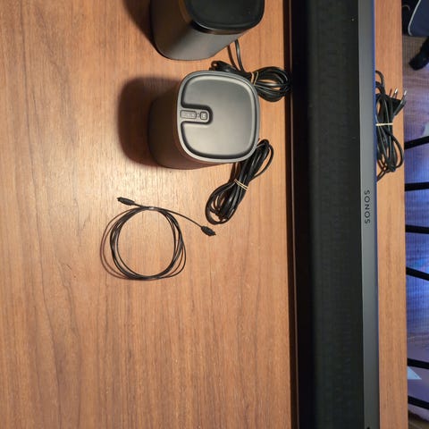 Sonos Playbar lydsbar i sort og Sonos Subwoofer i hvid og to højttalere.Systemet er trådløst og kan bruges til at forbedre lydoplevelsen til tv og musik. Lydsbaren er designet til at placeres under tv'et, mens subwooferen kan placeres på gulvet for dyb bas.