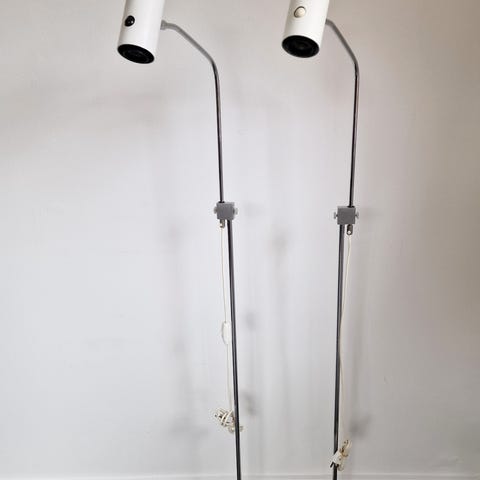 Standerlampe, Hans Schmidt's Lampedesign APS, Designer-standerlampe af den berømte danske lampedesigner Hans Schmidt med hvid base, chrome stang og 2 hvide lamper, hver med egen afbryder. Fin stand og fuldt funktionsdygtig. Basens underside er rusten. Fra ca. 1970'erne eller 1980'erne.