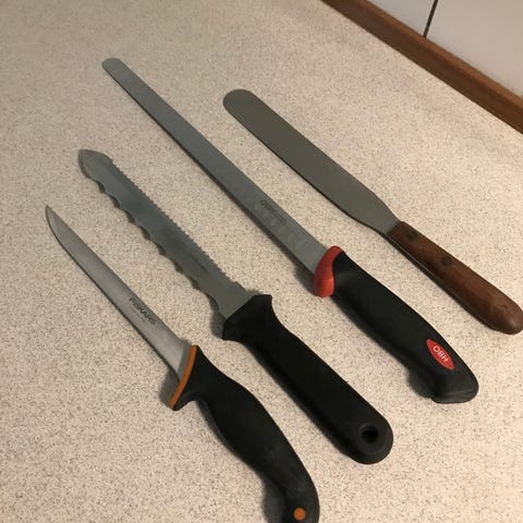 3 x Fiskars og zwilling køkkenknive i forskellige designs med skær af rustfrit stål og håndtag i plastik og metal. Knivene er velegnede til forskellige køkkenopgaver som skæring af brød og andre fødevarer.