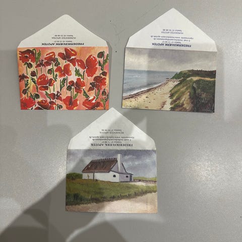 Samling af apotek kuverter med forskellige motiver, herunder natur, bybilleder, blomster og illustrationer. Postkortene varierer i størrelse og design og kan anvendes til samling eller dekoration. Sælges for 2 kr pr stk
