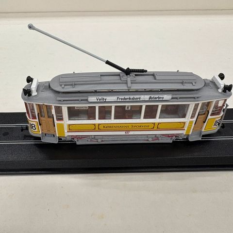 Modelsporvogn. Motorvogn 437 (Scandia) 1918. Københavns Sporveie. Str. H0. Pladen måler 21 x 5,5 cm.