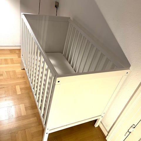Den ene side af tremmesengen kan afmonteres, når barnet bliver større og selv kan kravle op i eller ud af sengen.