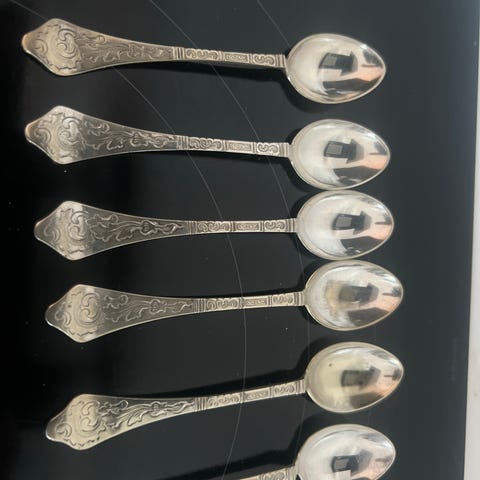 Sølv tesigte med udskåret dekorativt mønster og hulmønster til si-funktion. Tesigten er lavet i sølv og har en detaljeret og åben udskæring, der gør den velegnet til brug ved te-tilberedning. Ca 12 cm lang